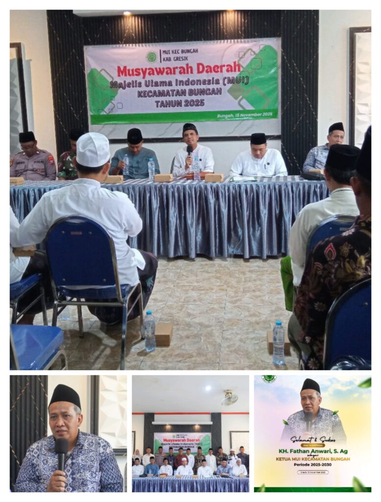 Gresik-ipnusantaramedia.com Musyawarah Daerah (MUSDA) Majelis Ulama Indonesia (MUI) Kecamatan Bungah, menetapkan KH. Fathan Anwari, S.Ag, sebagai Ketua Terpilih masa khidmah 2025-2030.   Kiai Fathan, dipilih secara musyawarah mufakah oleh Tim Formatur MUSDA MUI Bungah, pada Sabtu (15/11/2025), di Kantor MUI Kecamatan Bungah. Selain memilih ketua, kegiatan tadi juga menetapkan KH. Alauddin, Lc, sebagai Ketua